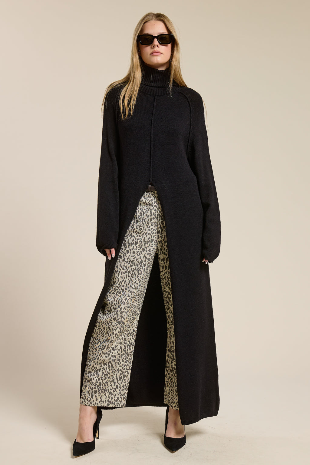 Long Black Knit Turtleneck Sweater Coat