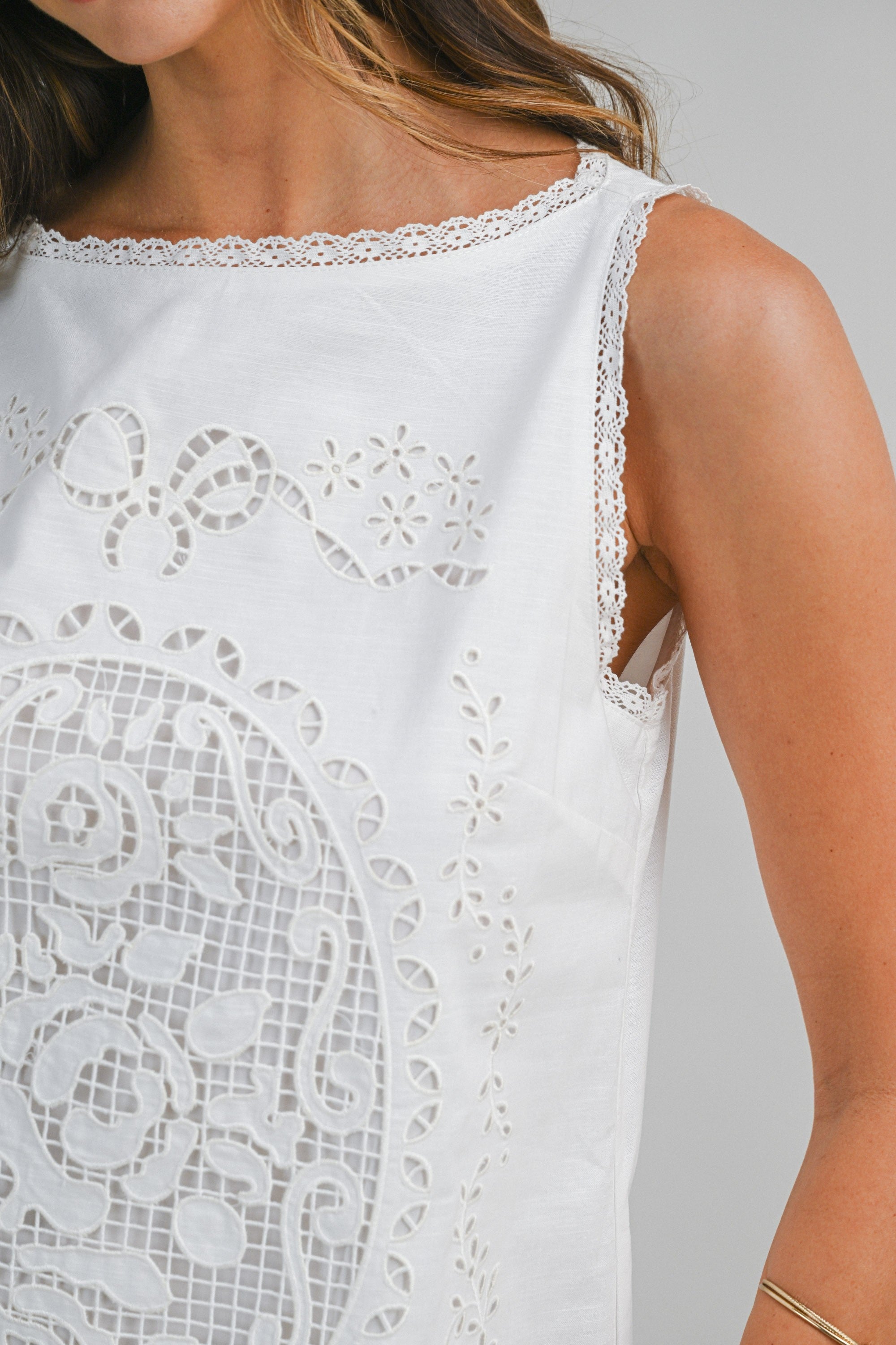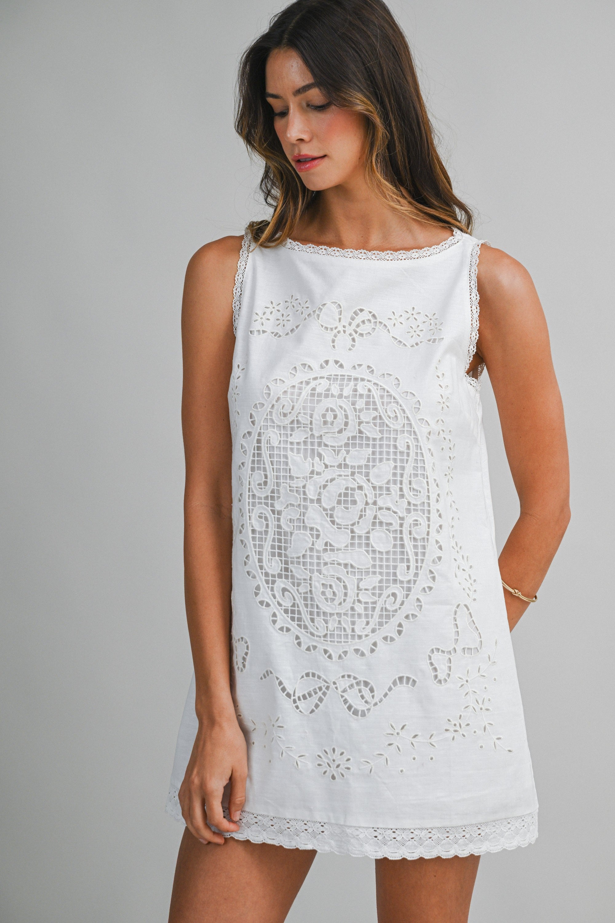 Timeless, feminine, and effortlessly beautiful, this ivory shift dress feels like a true heirloom piece with a fresh, modern touch. It features intricate eyelet cutwork with a stunning medallion design that adds texture and romance while keeping the look clean and polished. Delicate scalloped lace trims the neckline and hem, and the sleeveless straight silhouette creates an easy, flattering fit that feels both comfortable and refined. Lightweight and breathable, it’s perfect for bridal events, vacations, brunch dates, garden parties, or any moment you want to feel extra pretty without trying too hard.