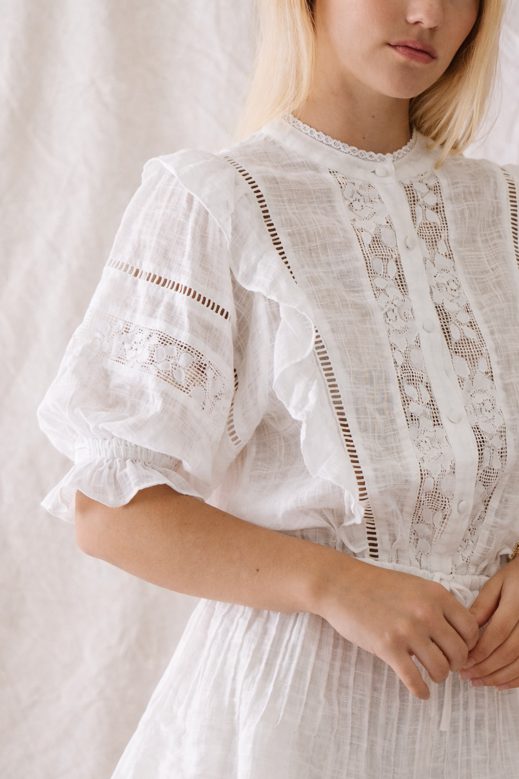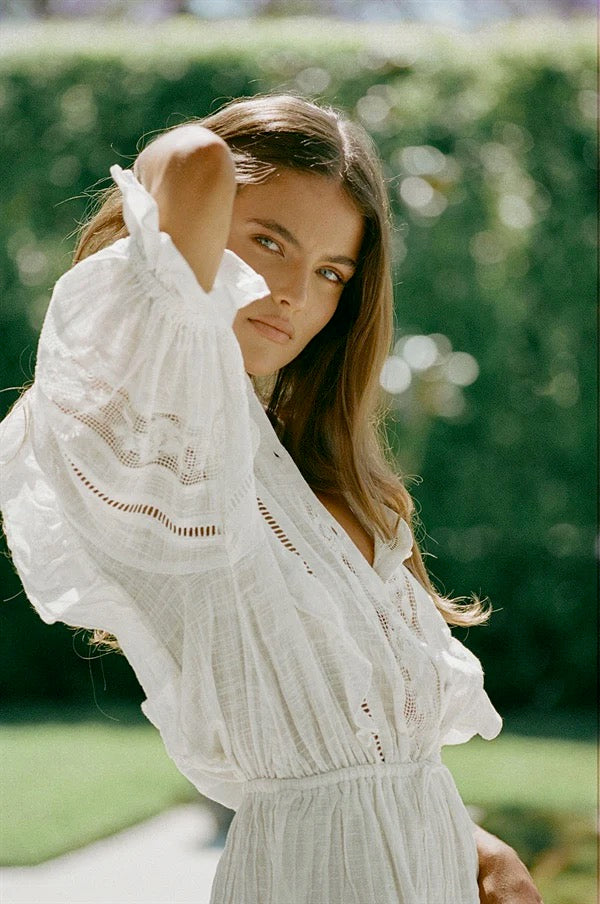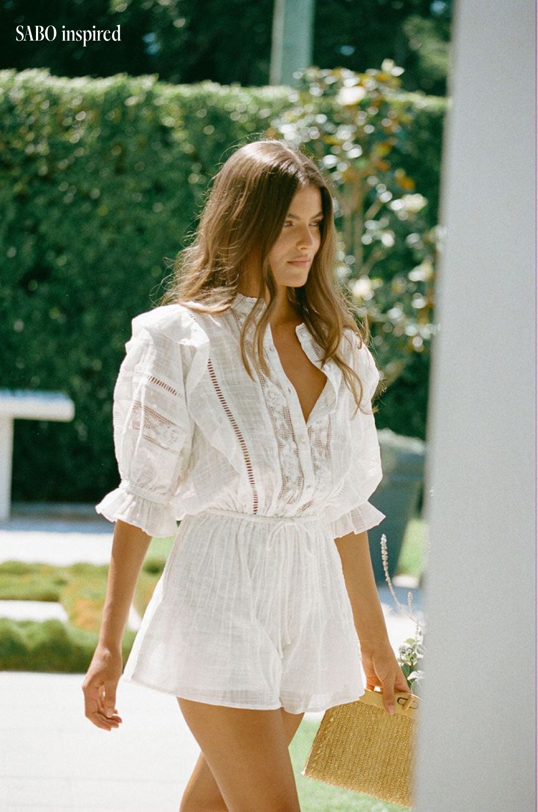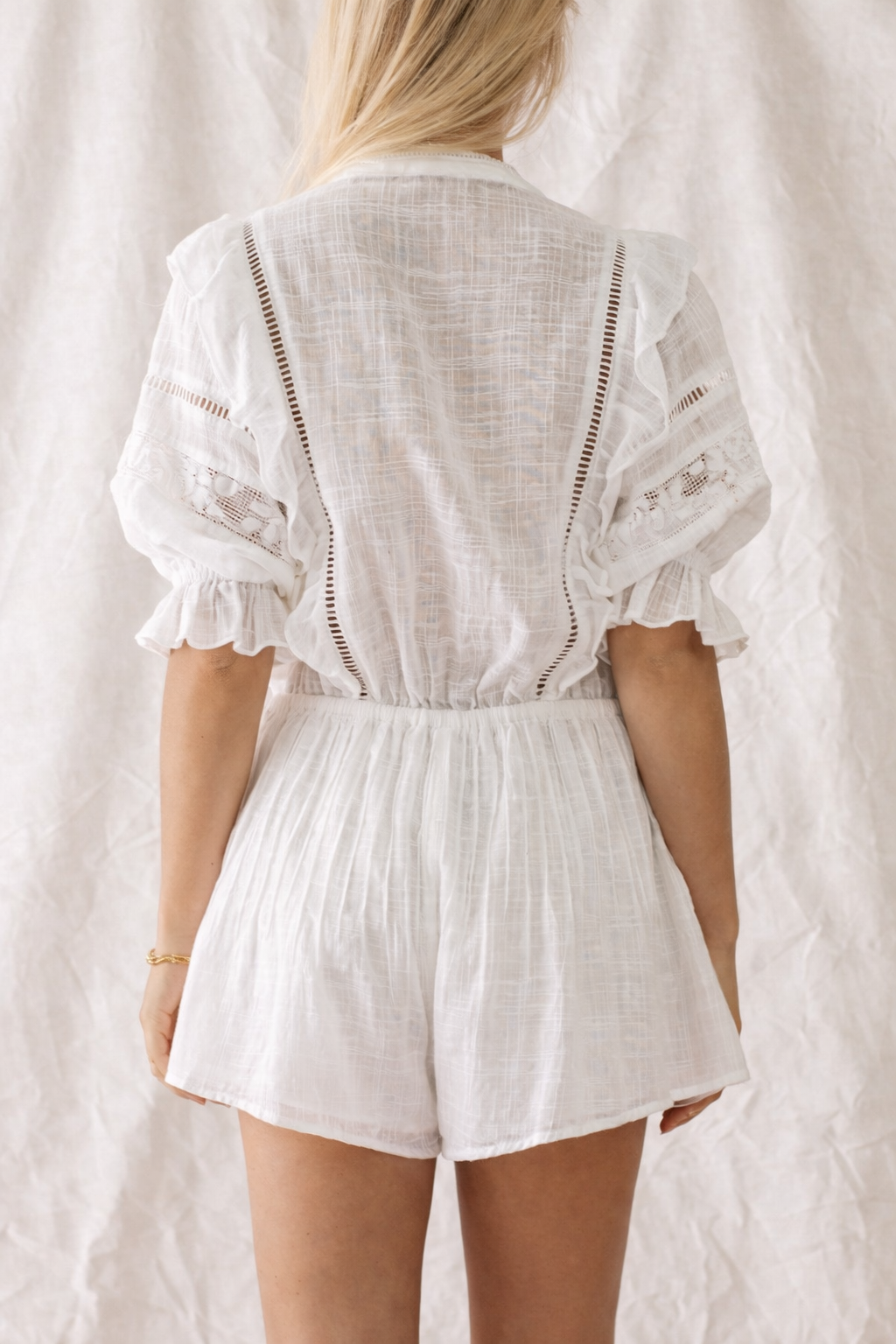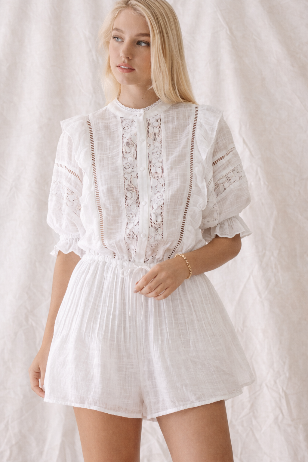 Designed with delicate lace insets, heirloom-inspired ladder trim, and flutter ruffle sleeves, this ivory romper brings a vintage European feel to a modern silhouette. The high neckline and button-front bodice add refined charm, while the elastic drawstring waist and softly pleated shorts create a flattering, easy fit.