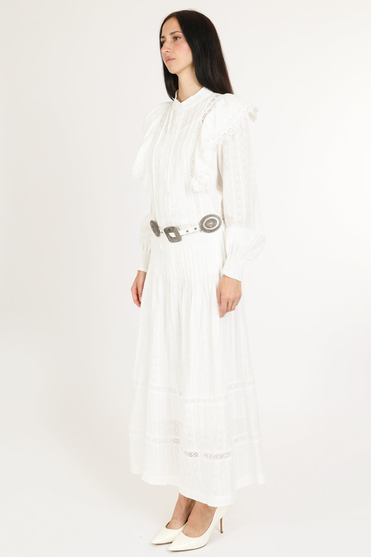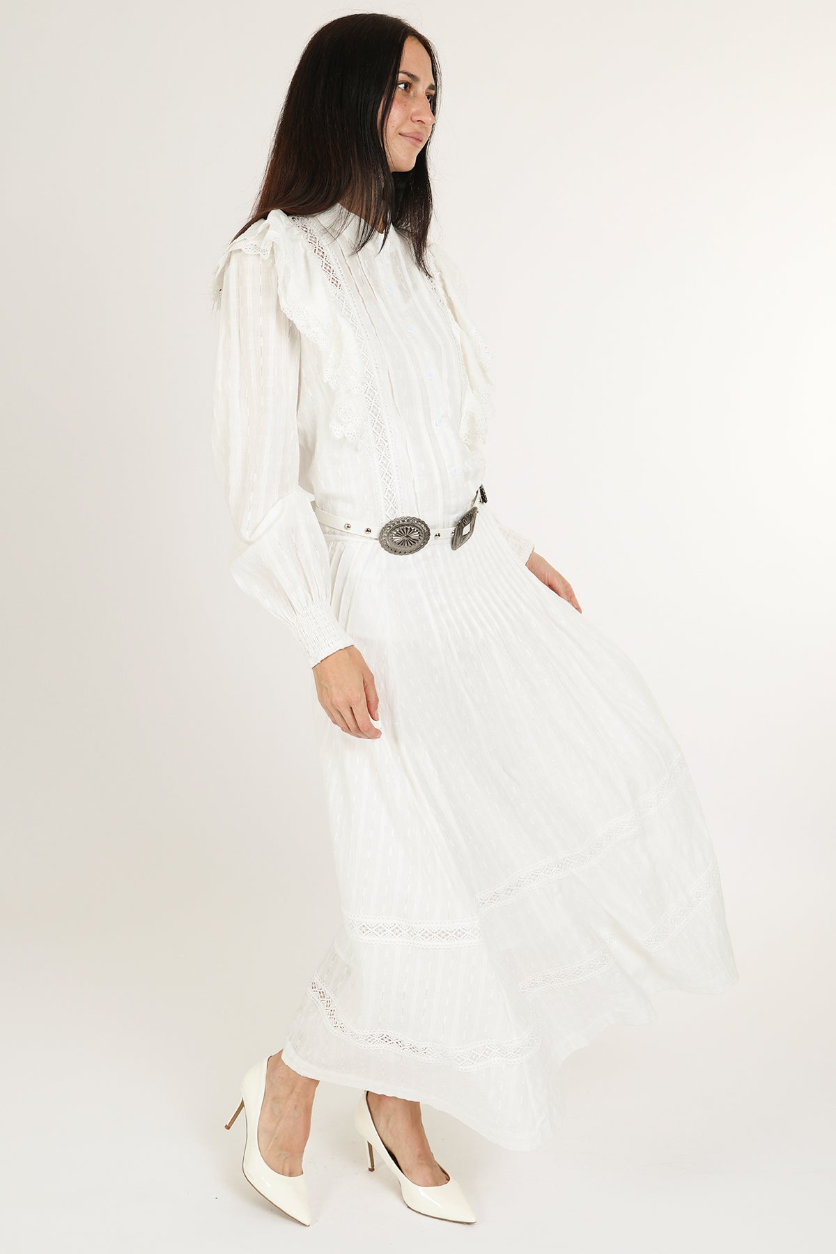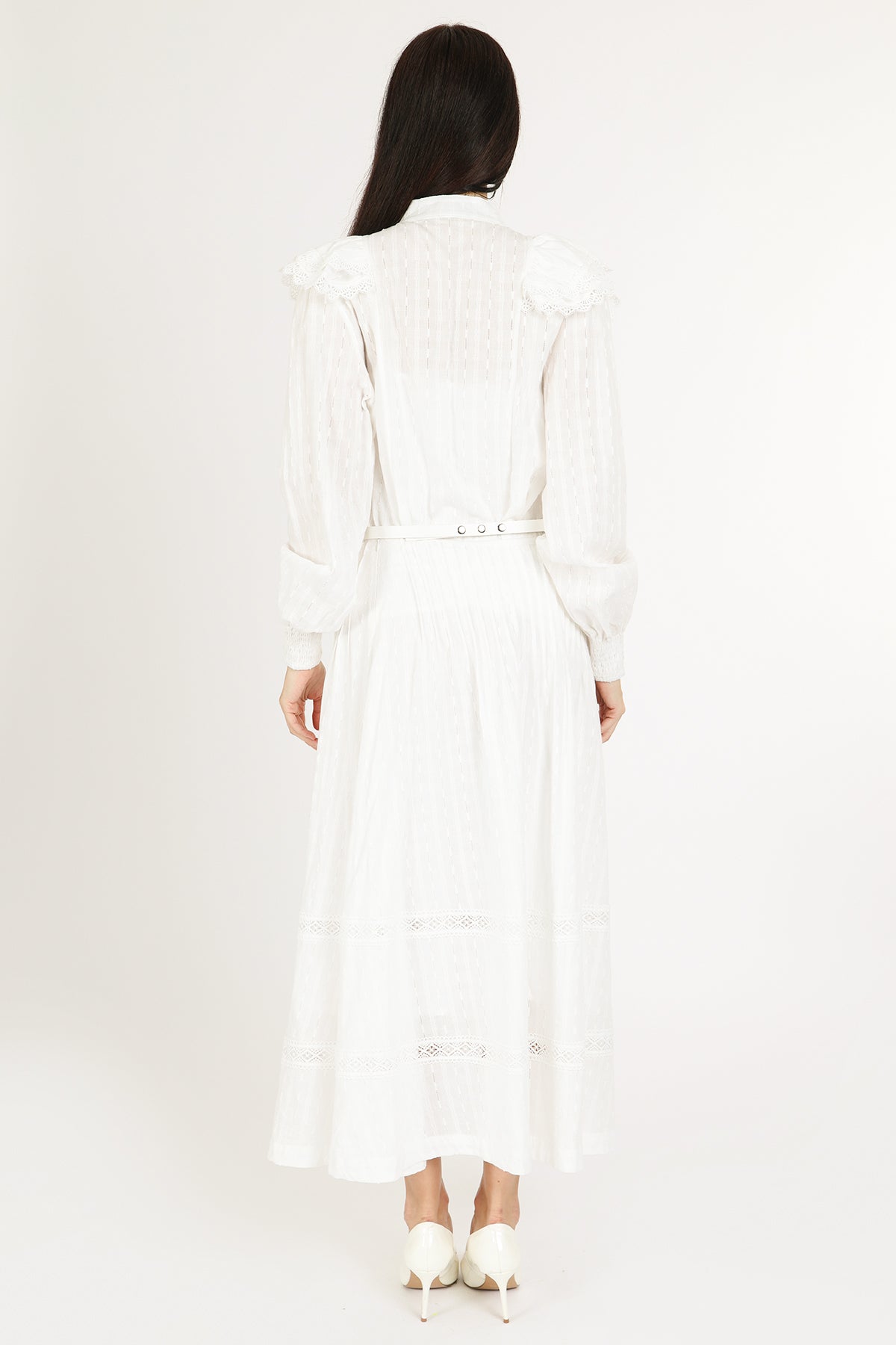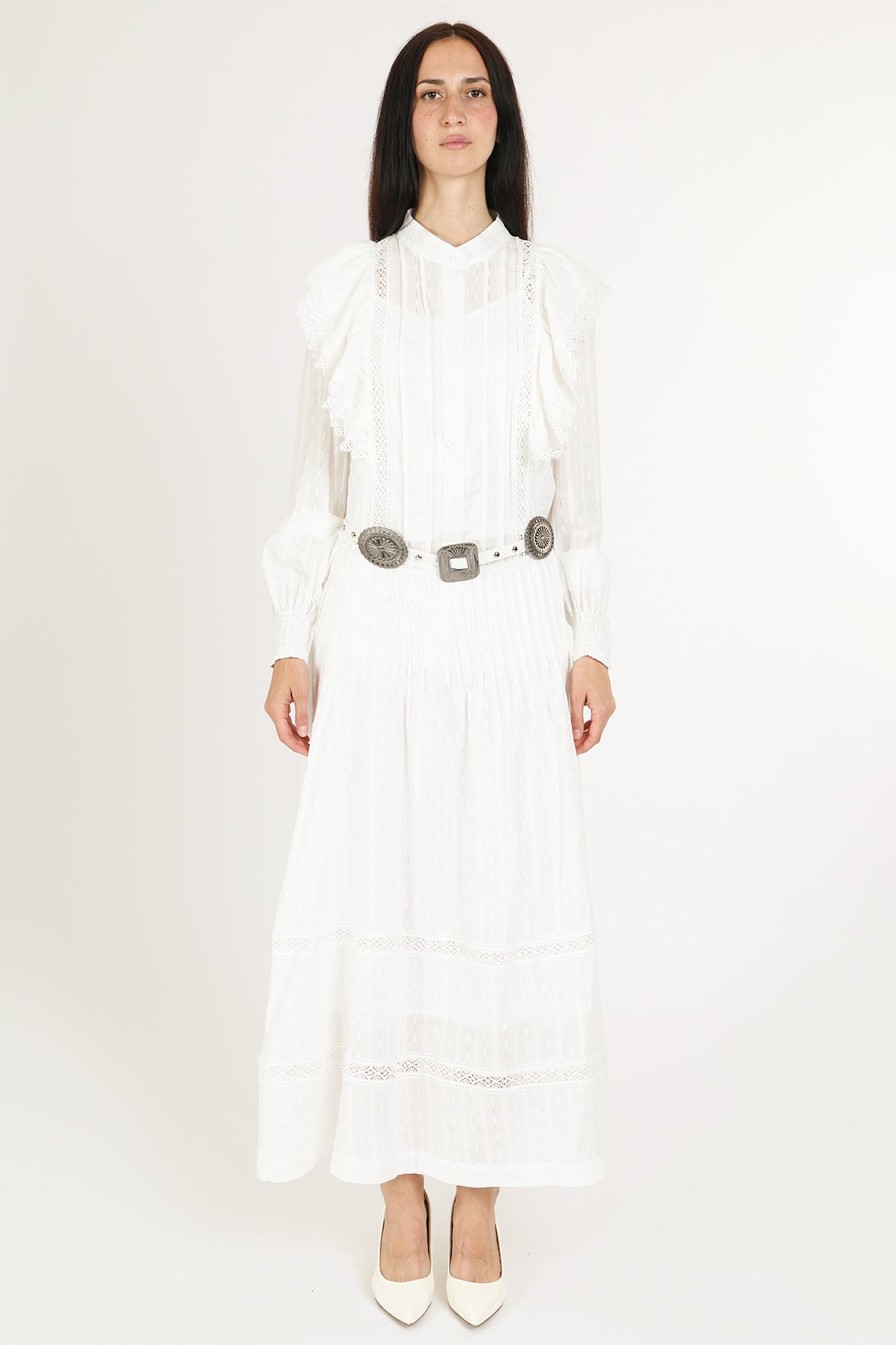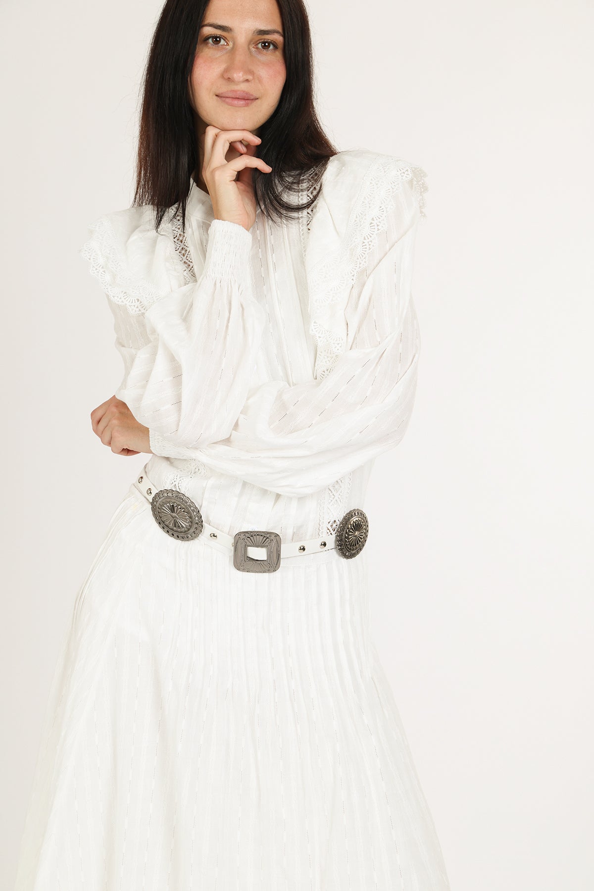 An effortlessly elegant two-piece set designed with timeless romance in mind. Crafted in a lightweight, airy fabric with delicate vertical texture, this heirloom-inspired set features a lace-trimmed blouse with soft ruffle shoulder detailing and a flowing pleated maxi skirt that moves beautifully with every step. The long sheer sleeves, button-front bodice, and intricate lace accents create a refined, vintage silhouette that feels both feminine and elevated.
