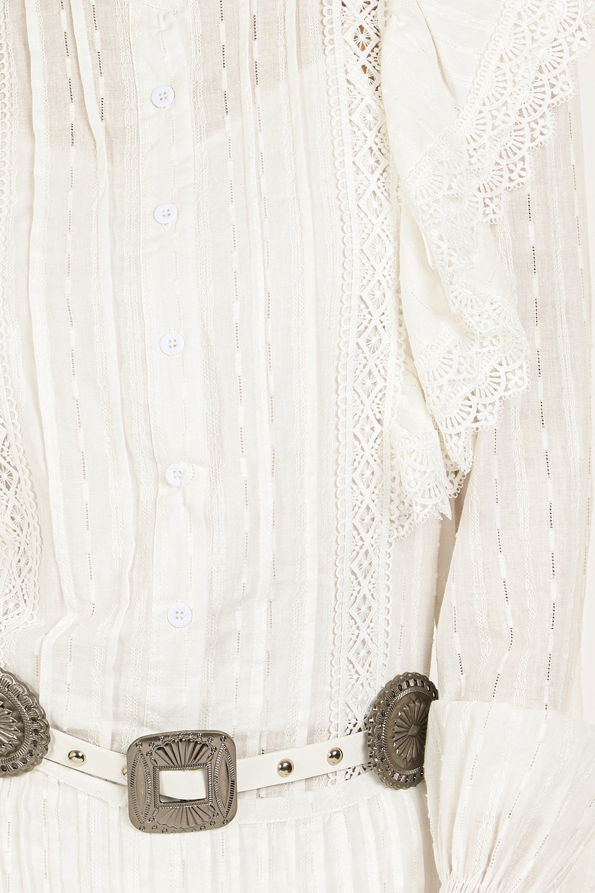 - Lace trim and ruffle shoulder detail