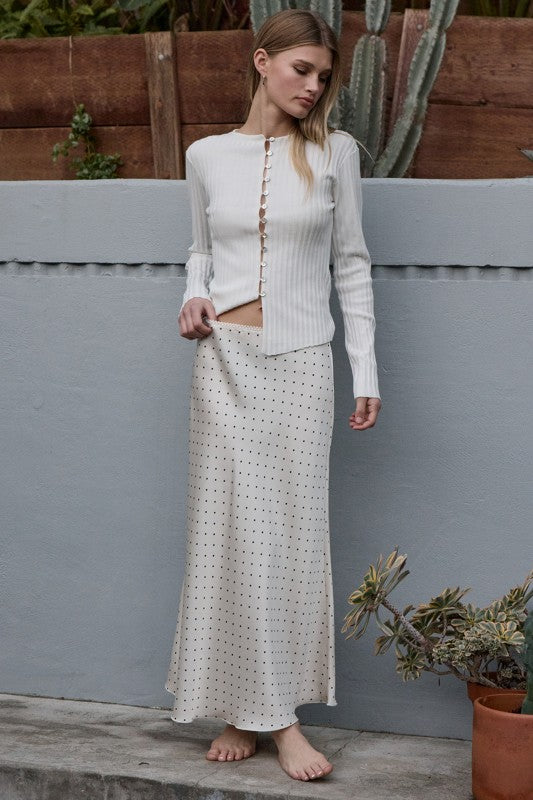 A timeless ivory polka dot satin midi skirt with an elegant, fluid drape and a softly flattering silhouette. Designed with a smooth pull-on waistband and delicate lace trim detail at the top for a subtle feminine touch. The lightweight satin fabric moves beautifully with every step, creating an effortless, romantic look that feels both elevated and easy to wear.