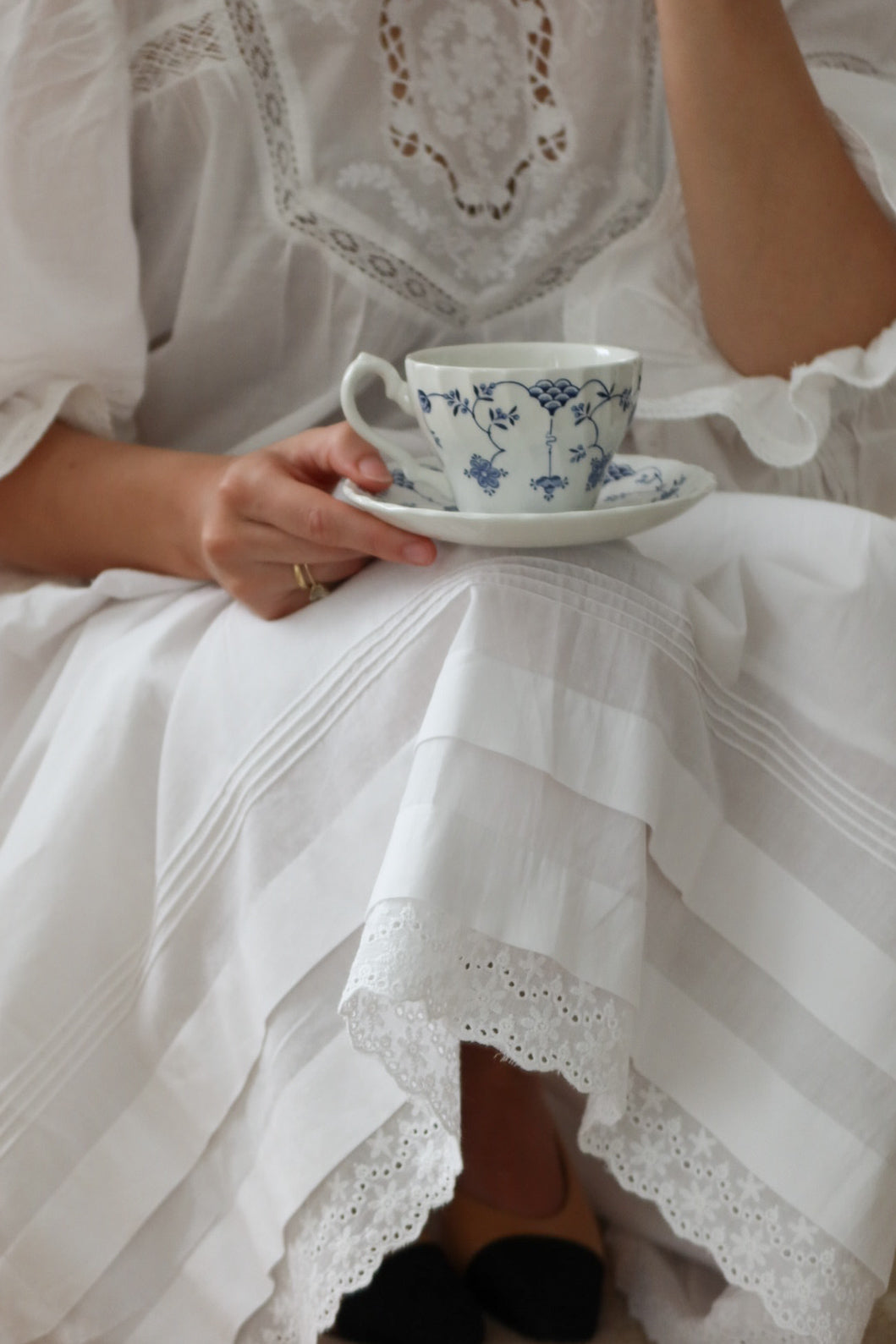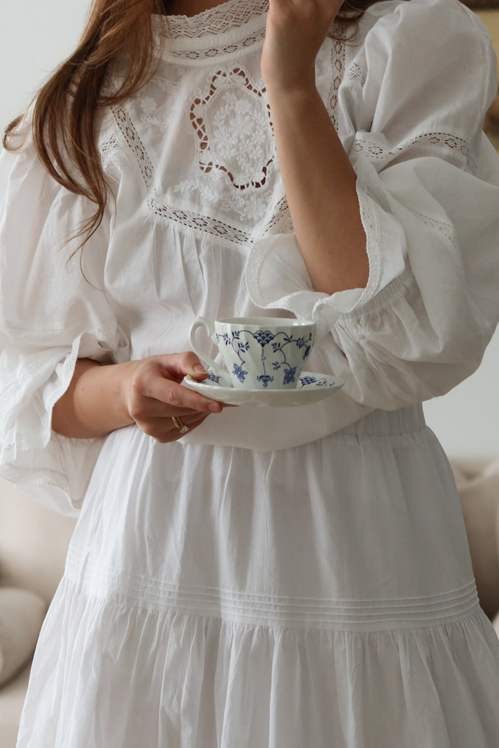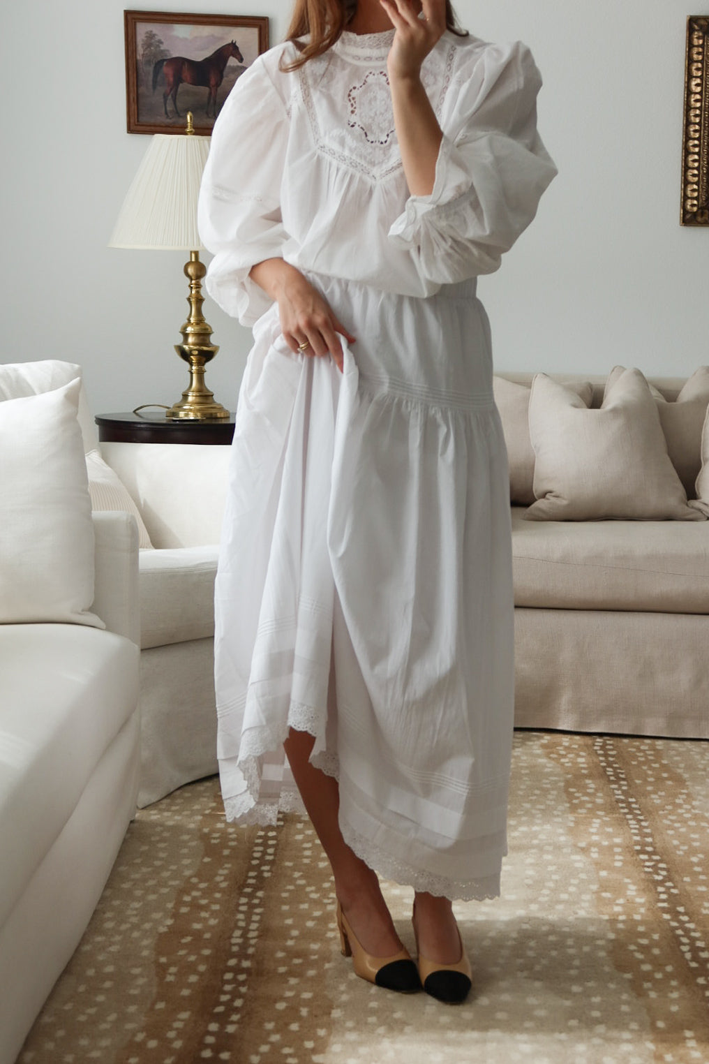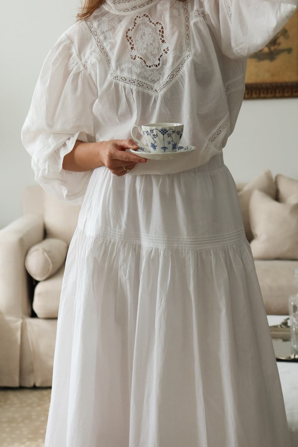 An effortlessly elegant cotton midi skirt designed with soft volume and delicate detailing. Crafted in crisp white, this skirt features gentle tiered seaming, subtle pintuck accents, and a scalloped lace hem that adds a romantic, heirloom finish. The elastic waistband offers comfort and ease while maintaining a refined silhouette that moves beautifully with every step.