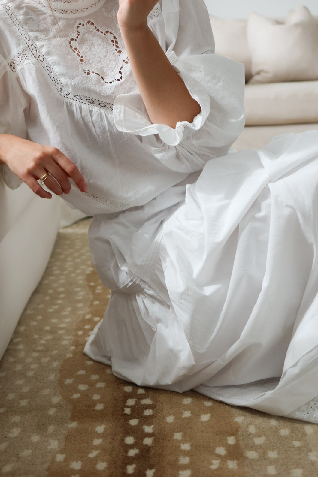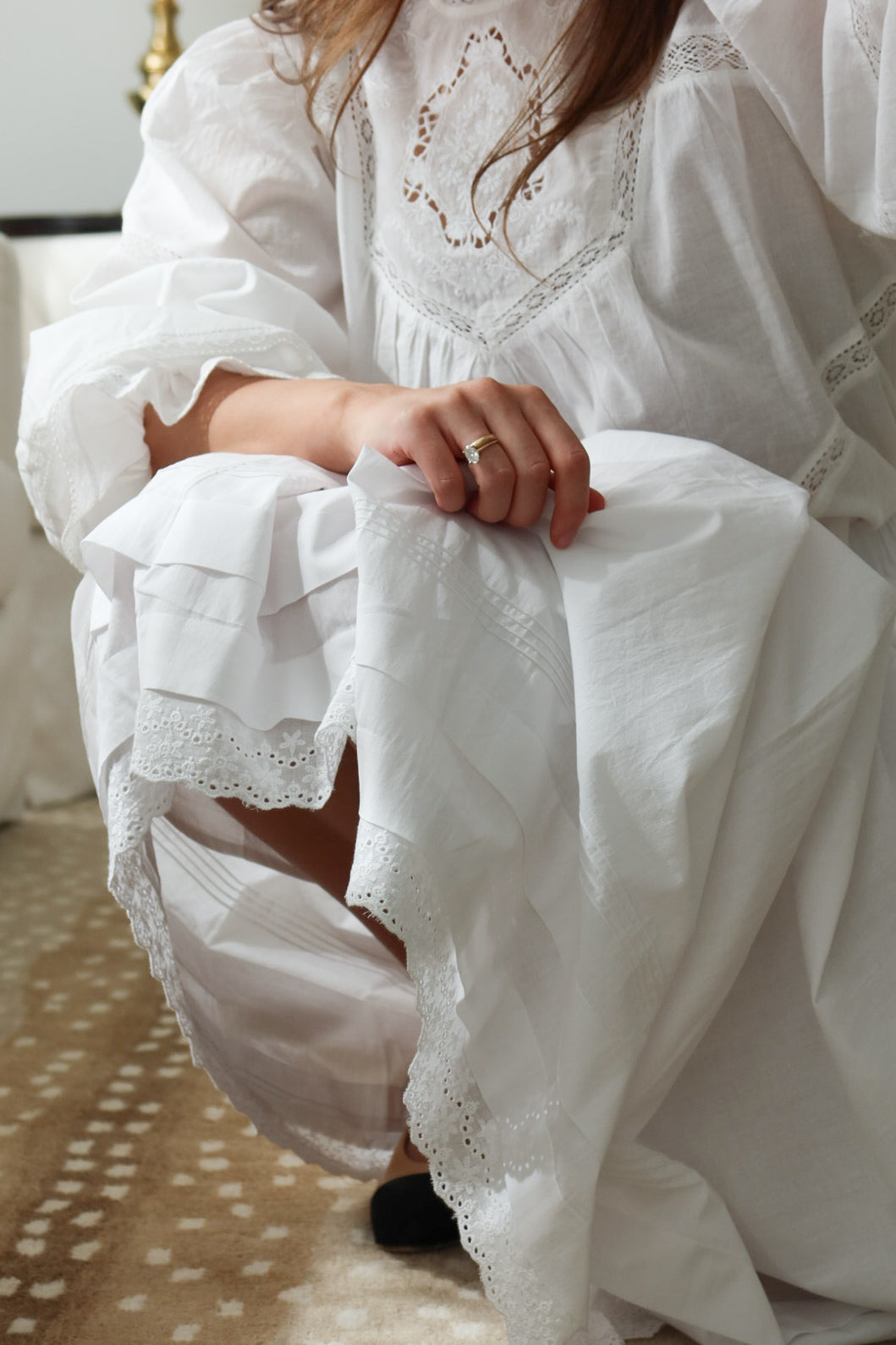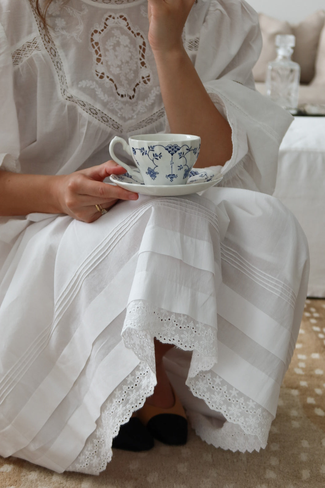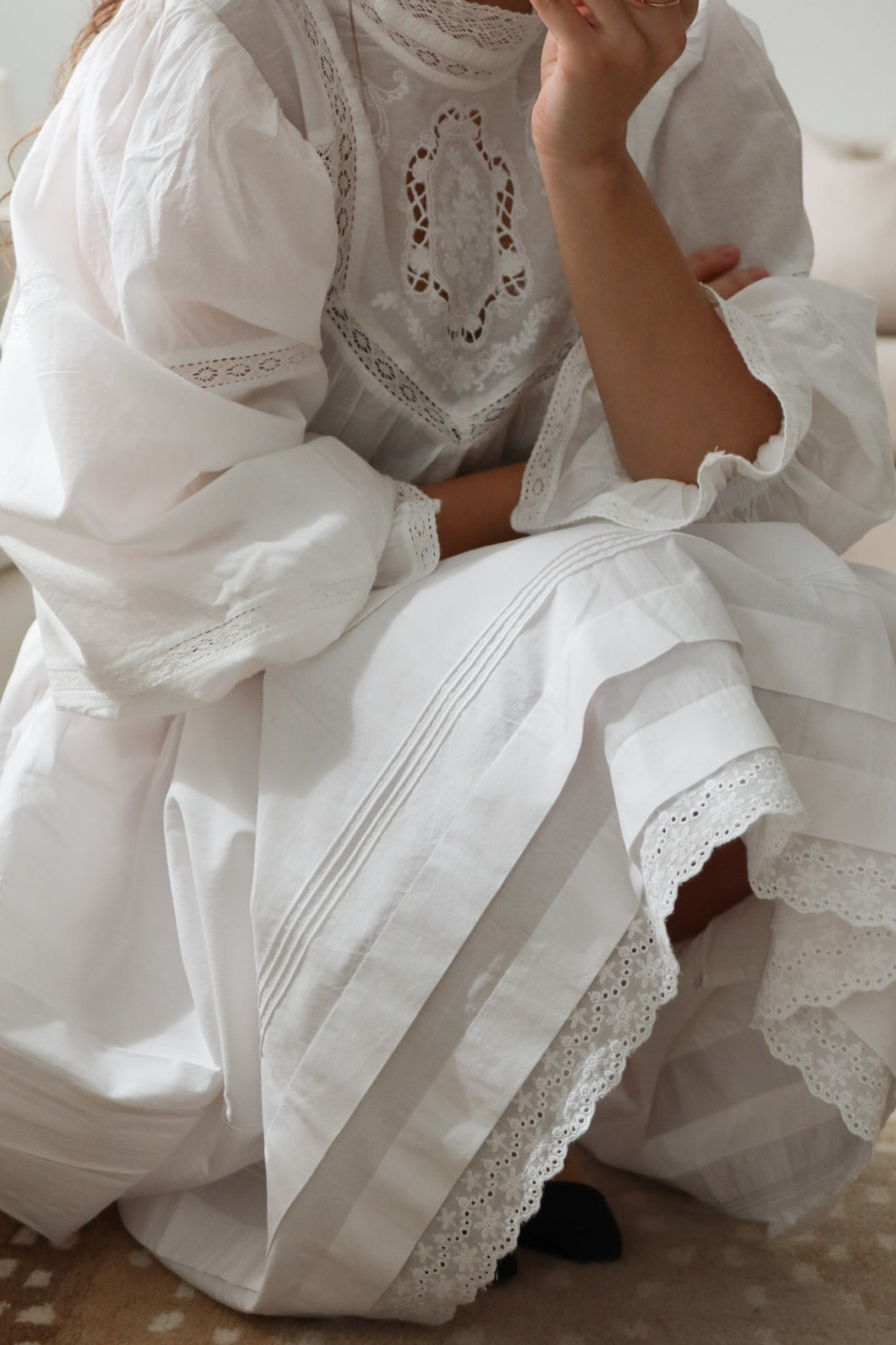 An effortlessly elegant cotton midi skirt designed with soft volume and delicate detailing. Crafted in crisp white, this skirt features gentle tiered seaming, subtle pintuck accents, and a scalloped lace hem that adds a romantic, heirloom finish. The elastic waistband offers comfort and ease while maintaining a refined silhouette that moves beautifully with every step.