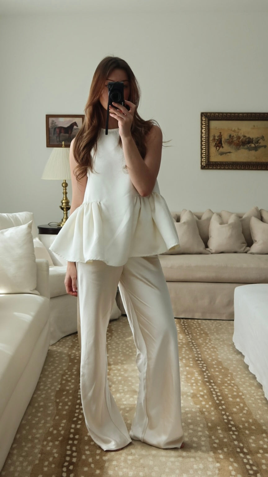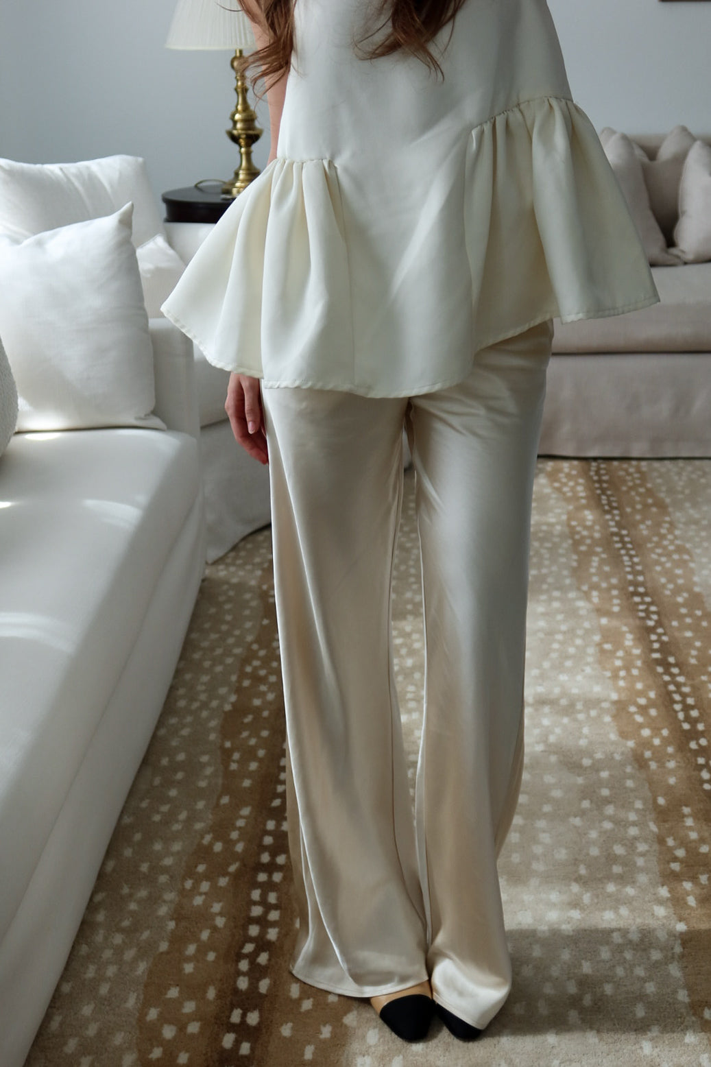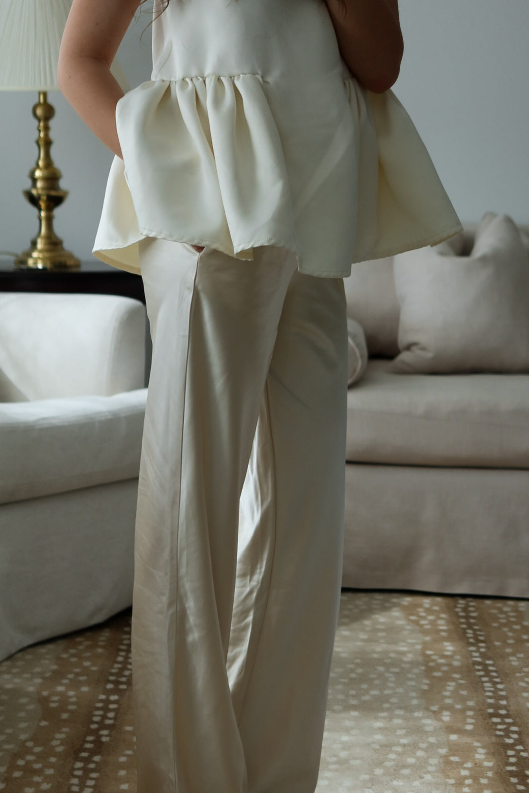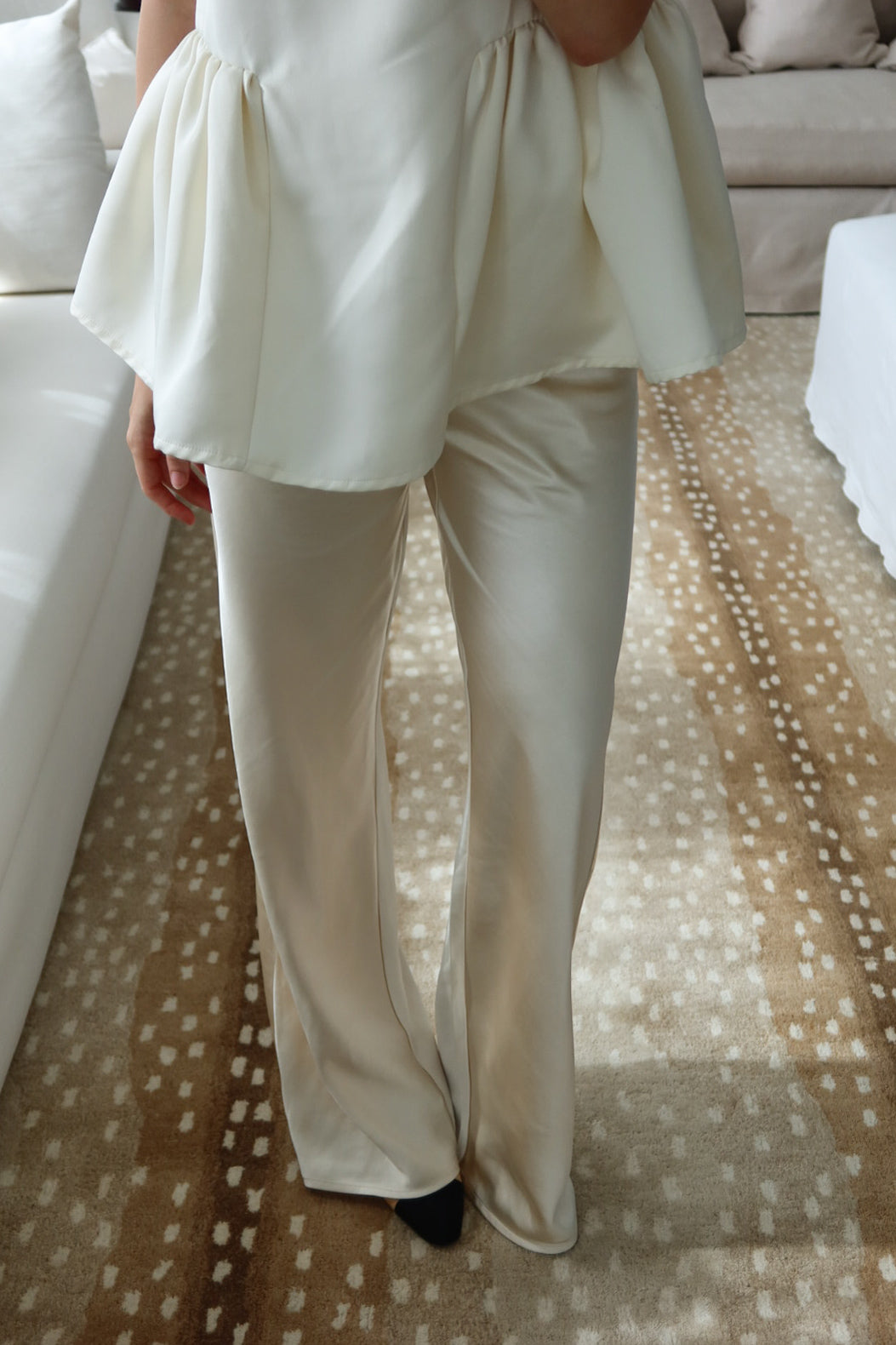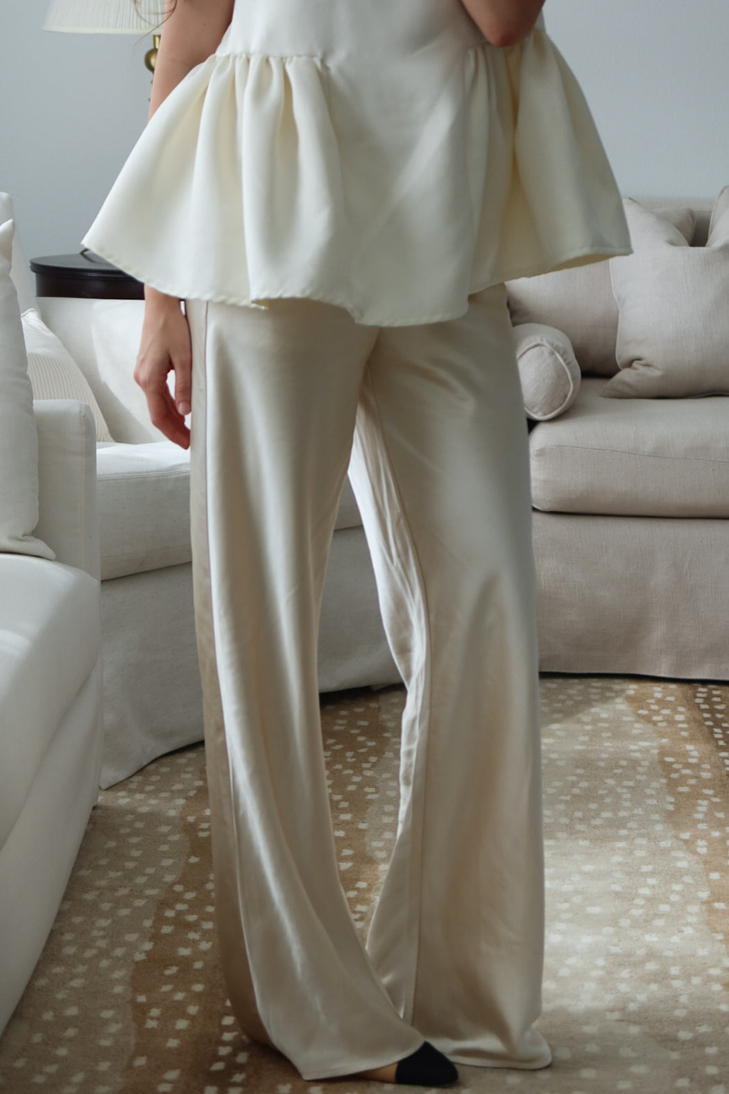 An effortlessly chic wide-leg pant crafted in a soft ivory satin feel, luminous drape. Designed with a comfortable elastic waistband and delicate drawstring tie, this pant blends relaxed elegance with refined simplicity. The elongated silhouette skims the body beautifully, creating graceful movement and a flattering, lengthening effect.