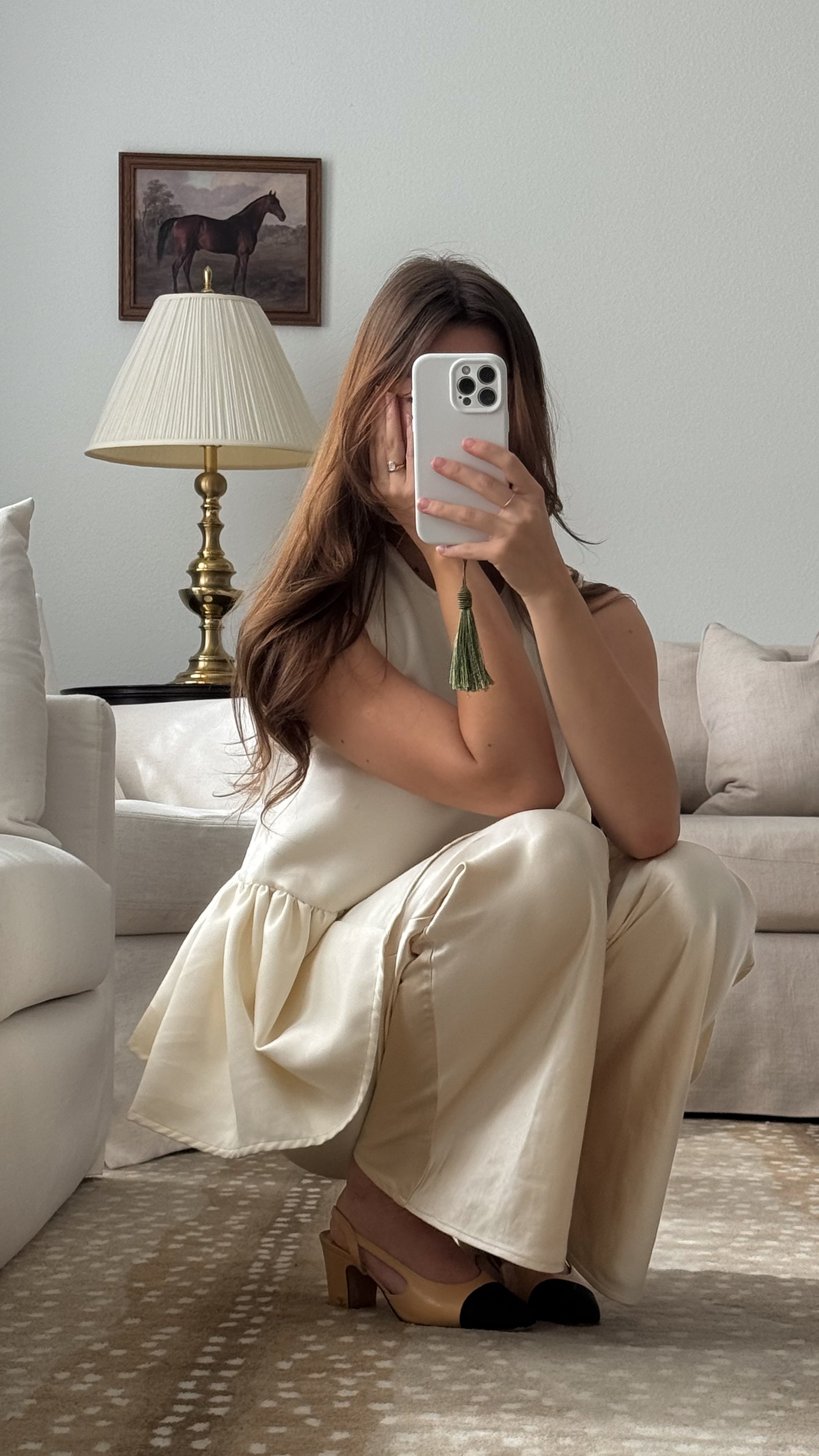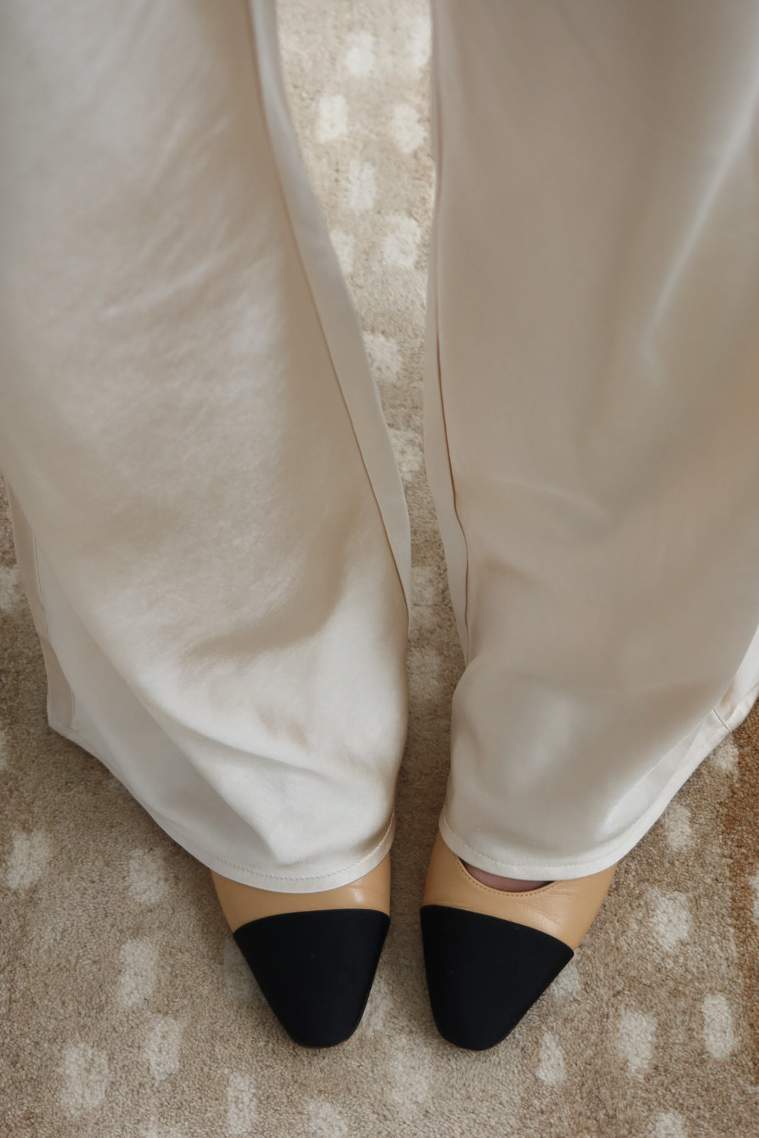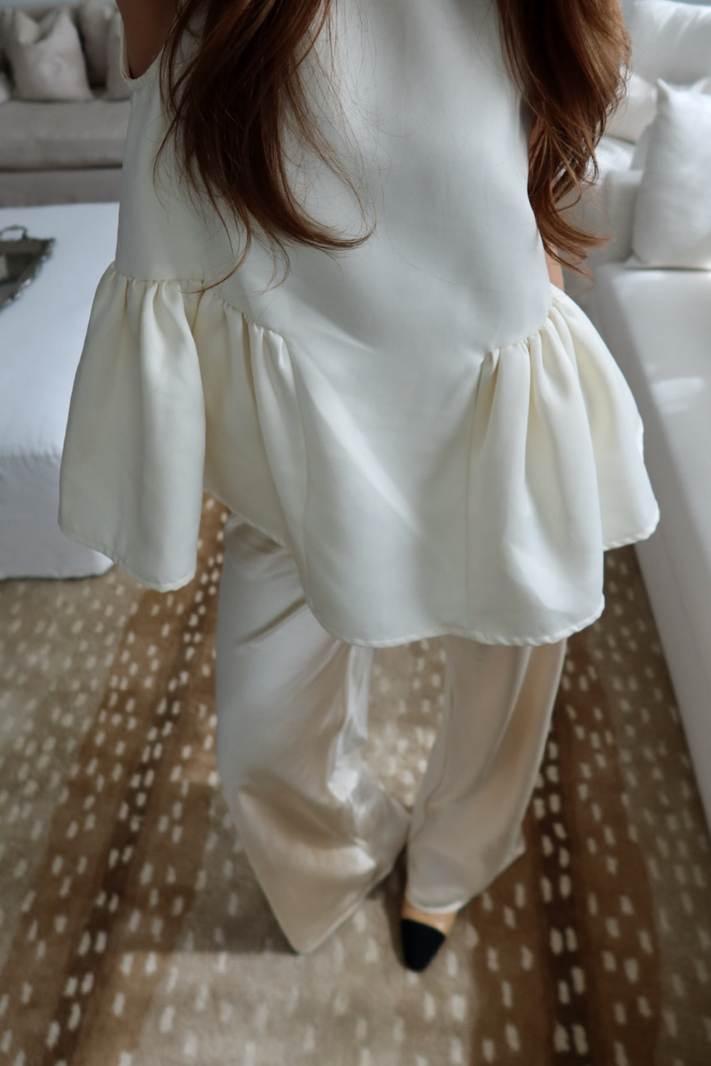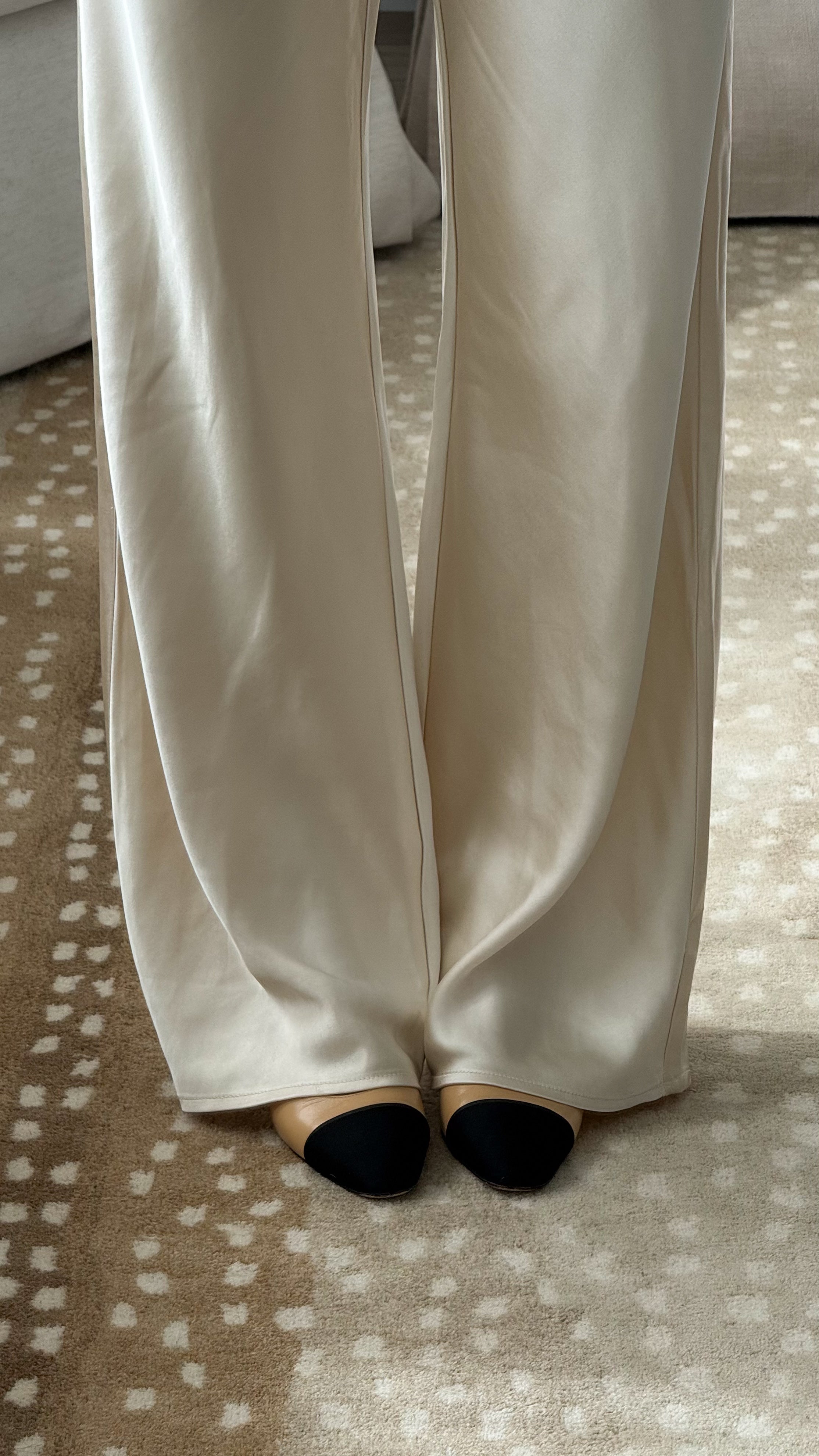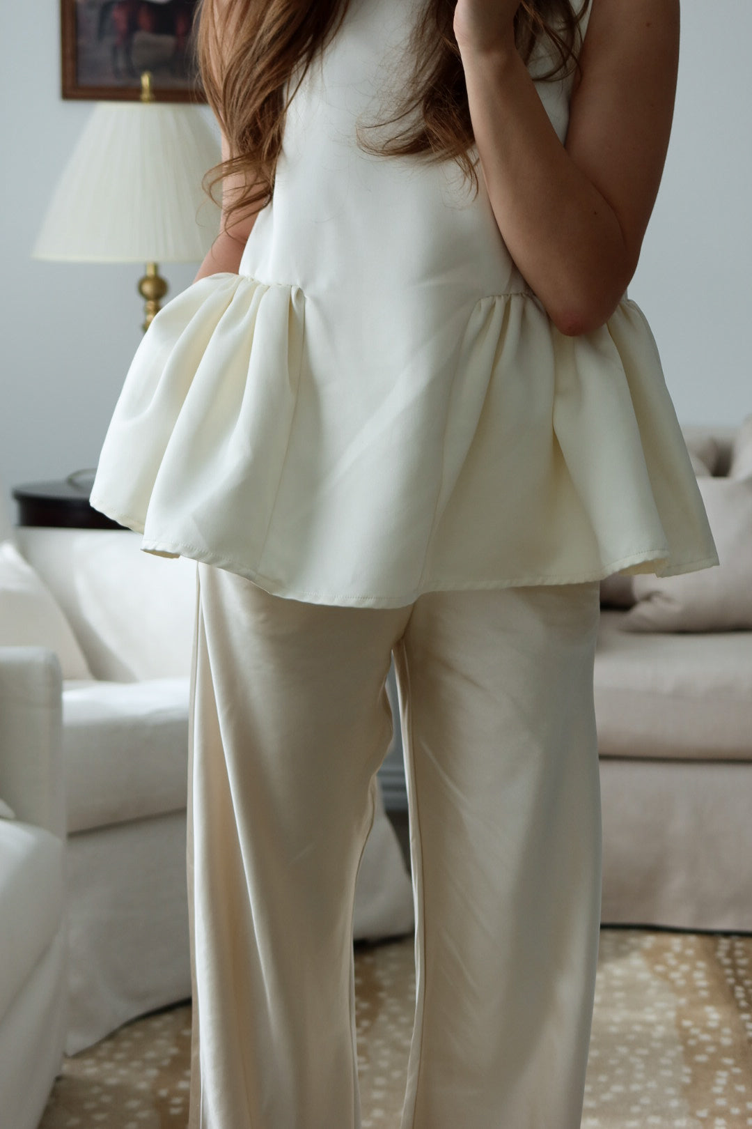 An effortlessly chic wide-leg pant crafted in a soft ivory satin feel, luminous drape. Designed with a comfortable elastic waistband and delicate drawstring tie, this pant blends relaxed elegance with refined simplicity. The elongated silhouette skims the body beautifully, creating graceful movement and a flattering, lengthening effect.
